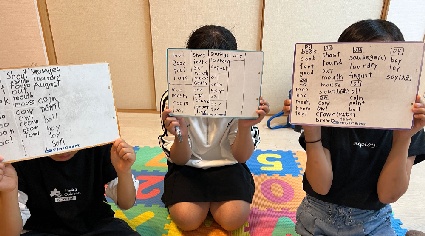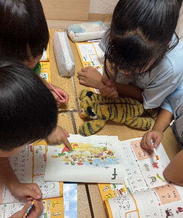 単語だけでなく会話文の徹底的な口頭練習後、アクティビティを通して先生やお友だち同士でフルセンテンス(文)で質問したり答えたりできるようにします。習った表現を使いみんなの前で英語で発表する機会も取り入れています。