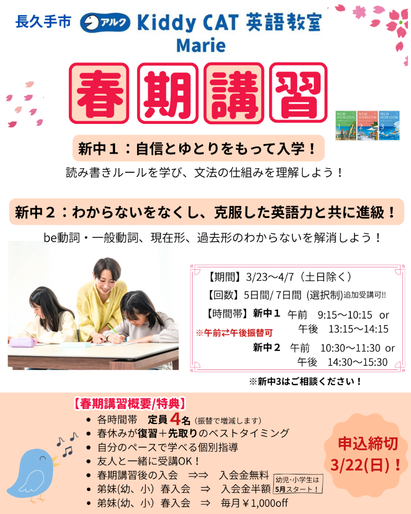 新中2生へ: わからないを減らし、自分でできたを増やせるのはこの春休み!新しい文法が増える前にわからない💦、難しい😓を自分でできた✨に変えよう!新中1生へ:中学英語の始まり!英語読めますか?書けますか?文法に入る前に基礎を学んでおこう!ルールを学ぶと読み書きに自信がつくよ!